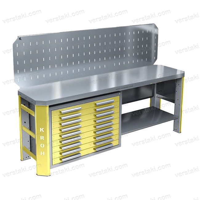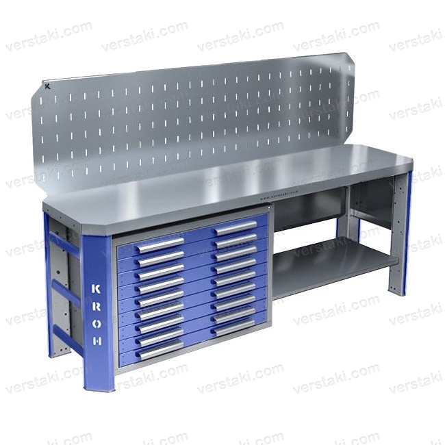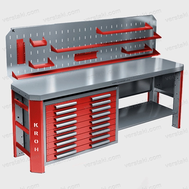 Повышенная прочность. Благодаря своей уникальной конструкции и толщине составных деталей, максимальная распределенная нагрузка на верстак может составлять до 1500 кг, а на ящики и полки 200 кг.