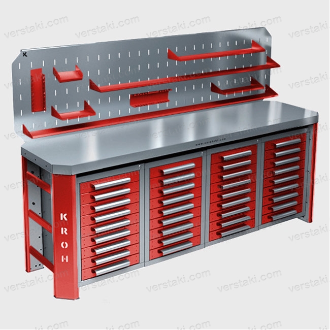 Повышенная прочность. Благодаря своей уникальной конструкции и толщине составных деталей, максимальная распределенная нагрузка на верстак может составлять до 1500 кг, а на ящики и полки 200 кг.
