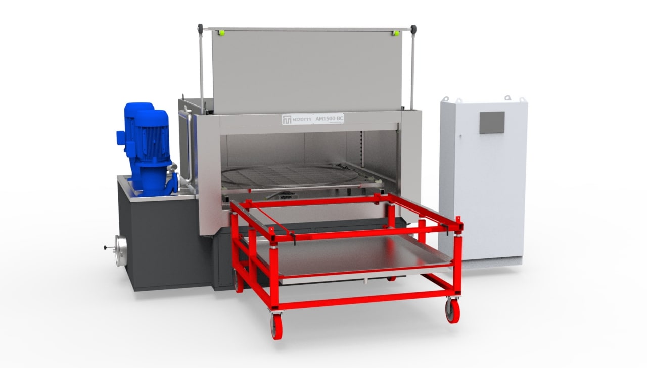 Промышленная моечная машина для подшипников с закатной платформой АМ1000 BC-Р используется для очистки подшипников букс колесных пар подвижного состава от грязи, смазки, масла в автоматическом режиме.
