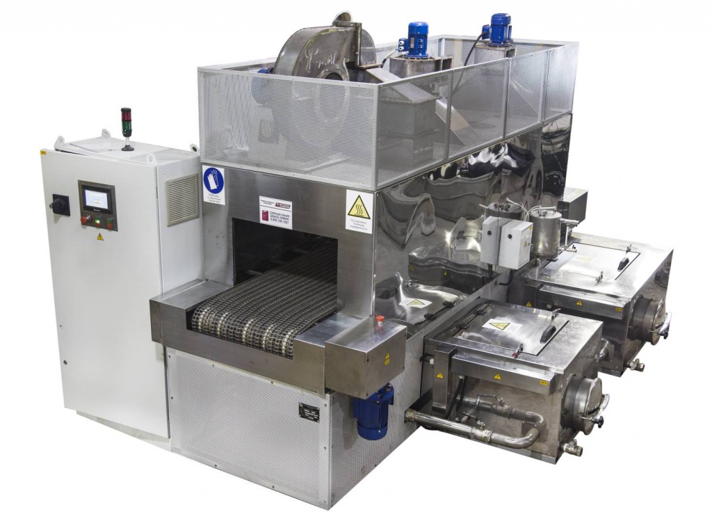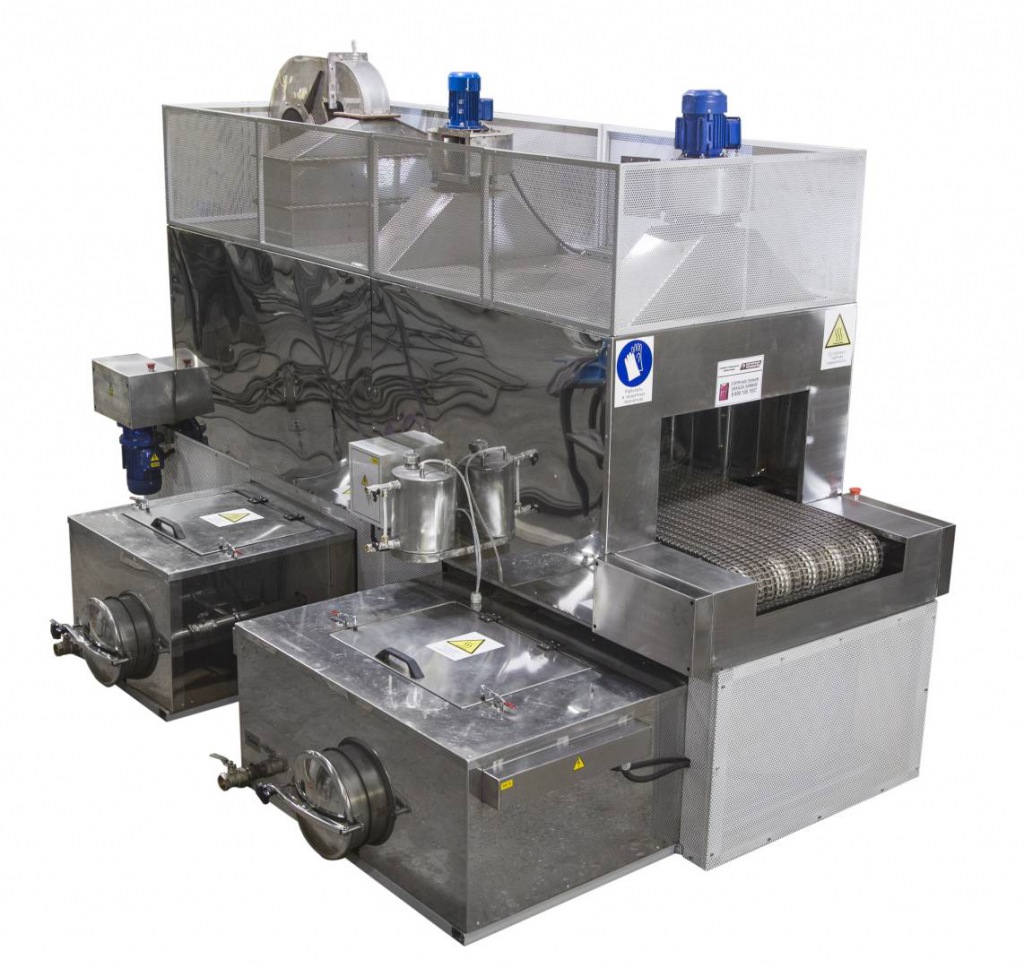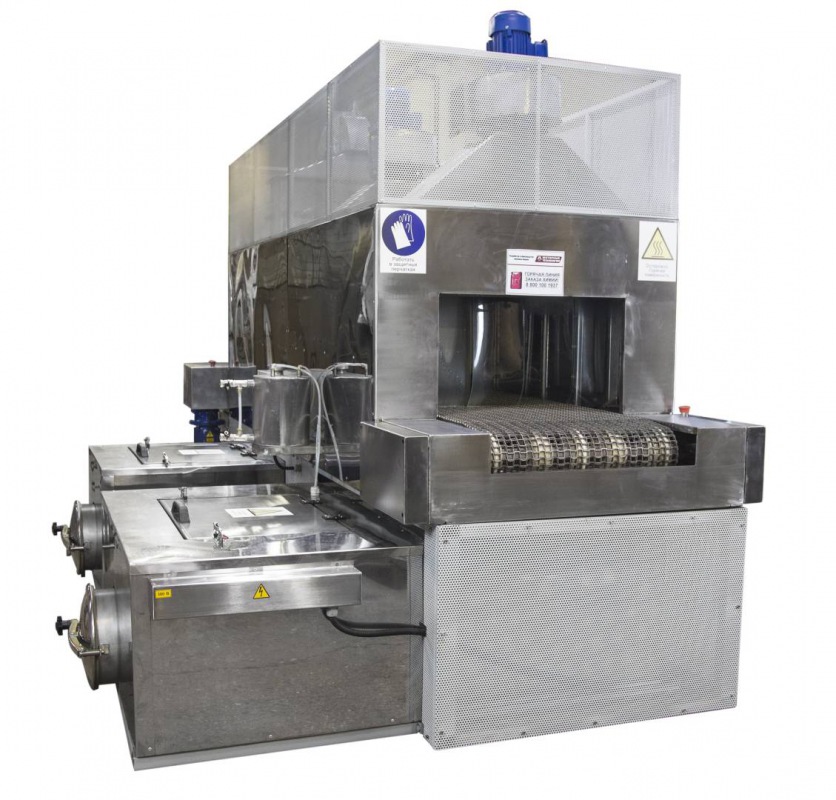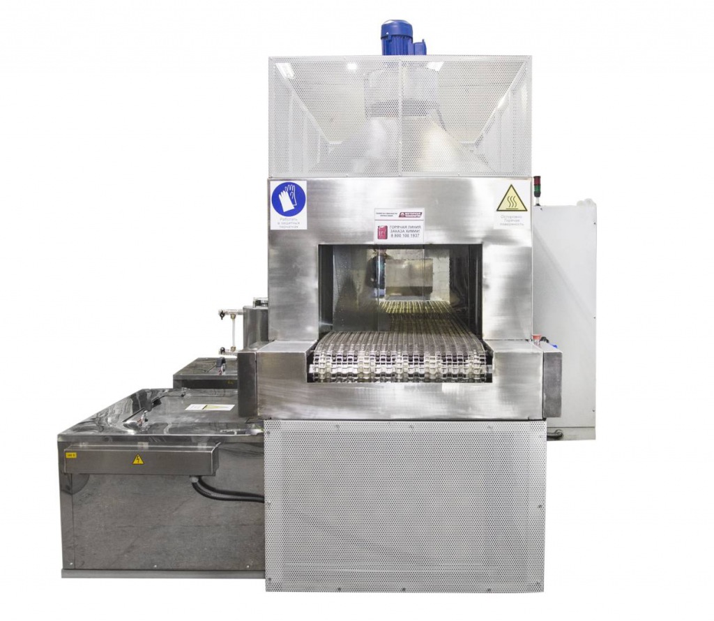 Моечная машина АМ1200 Т разработана для быстрой и качественной очистки больших партий деталей простой формы с небольшим весом. Проходная мойка работает по принципу линейного перемещения траспортера сквозь моечную камеру с последовательным прохождением стадий обработки. Установка представляет собой конвейерную линию, состоящую из секций. В базовой комплектации поставляется только секция обезжиривания. Модули ополаскивания, пассивации, фосфатирования, сушки горячим воздухом согласовываются с заказчиком, исходя из требуемых технических процессов. Для перемещения деталей используется полотно из нержавеющей стали с натяжной станцией. Перед зонами загрузки и выгрузки установлены воздушные завесы, предотвращающие выход пара и капель раствора из моечной камеры. В тамбурных зонах присутствуют силиконовые шторки, выполняющие функцию разграничения секций.