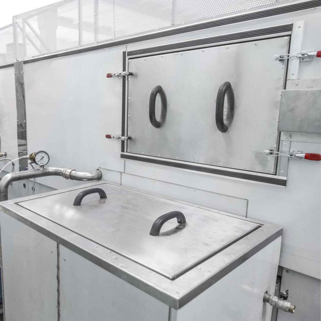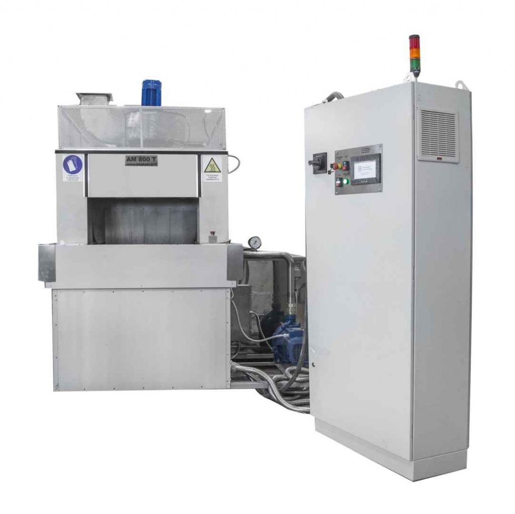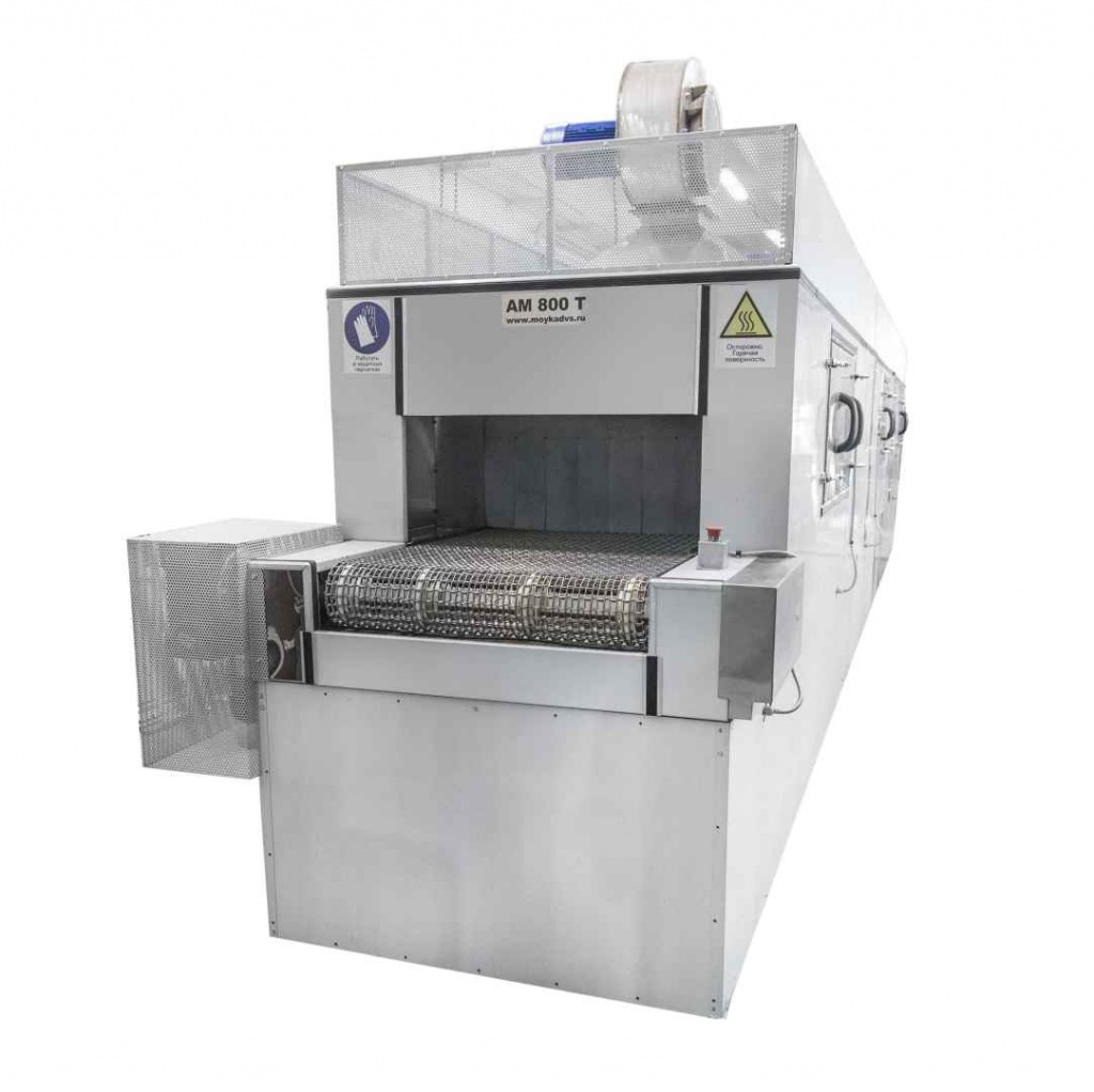 Моечная машина АМ800 Т разработана для быстрой и качественной очистки больших партий деталей простой формы с небольшим весом. Проходная мойка работает по принципу линейного перемещения траспортера сквозь моечную камеру с последовательным прохождением стадий обработки. Установка представляет собой конвейерную линию, состоящую из секций. В базовой комплектации поставляется только секция обезжиривания. Модули ополаскивания, пассивации, фосфатирования, сушки горячим воздухом согласовываются с заказчиком, исходя из требуемых технических процессов. Для перемещения деталей используется полотно из нержавеющей стали с натяжной станцией. Перед зонами загрузки и выгрузки установлены воздушные завесы, предотвращающие выход пара и капель раствора из моечной камеры. В тамбурных зонах присутствуют силиконовые шторки, выполняющие функцию разграничения секций.