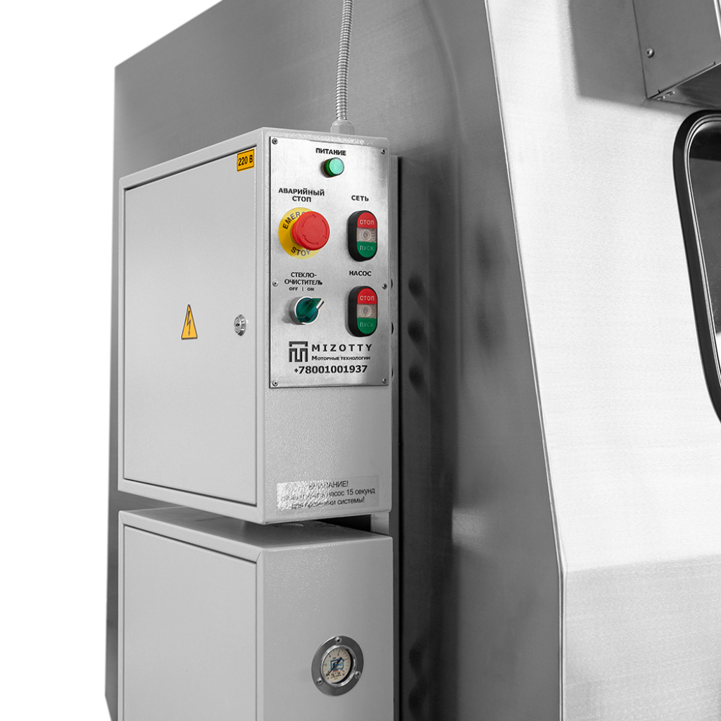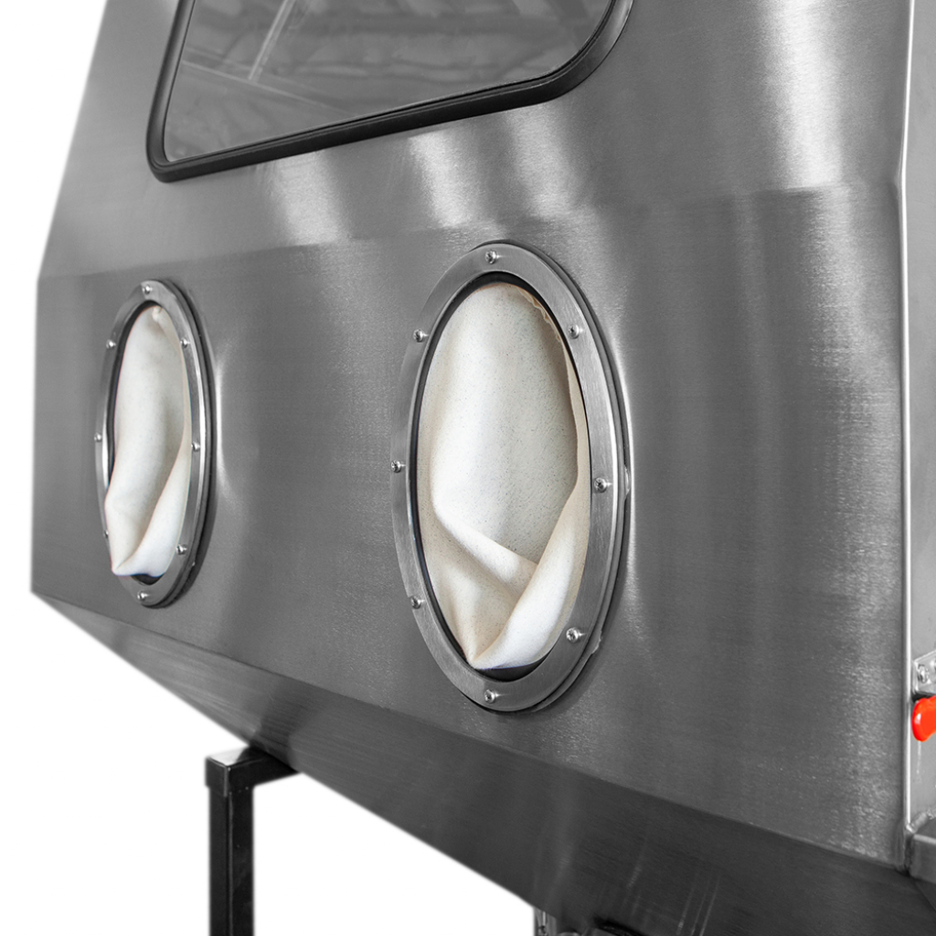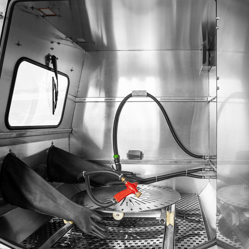 Представляет собой камеру с замкнутым циклом очистки. Моющие компоненты – мелкая фракция стеклянной дроби (стеклошариков) и обычная водопроводная вода. Основной эффект очистки поверхности достигается за счет энергии микровзрыва на очищаемой поверхности.