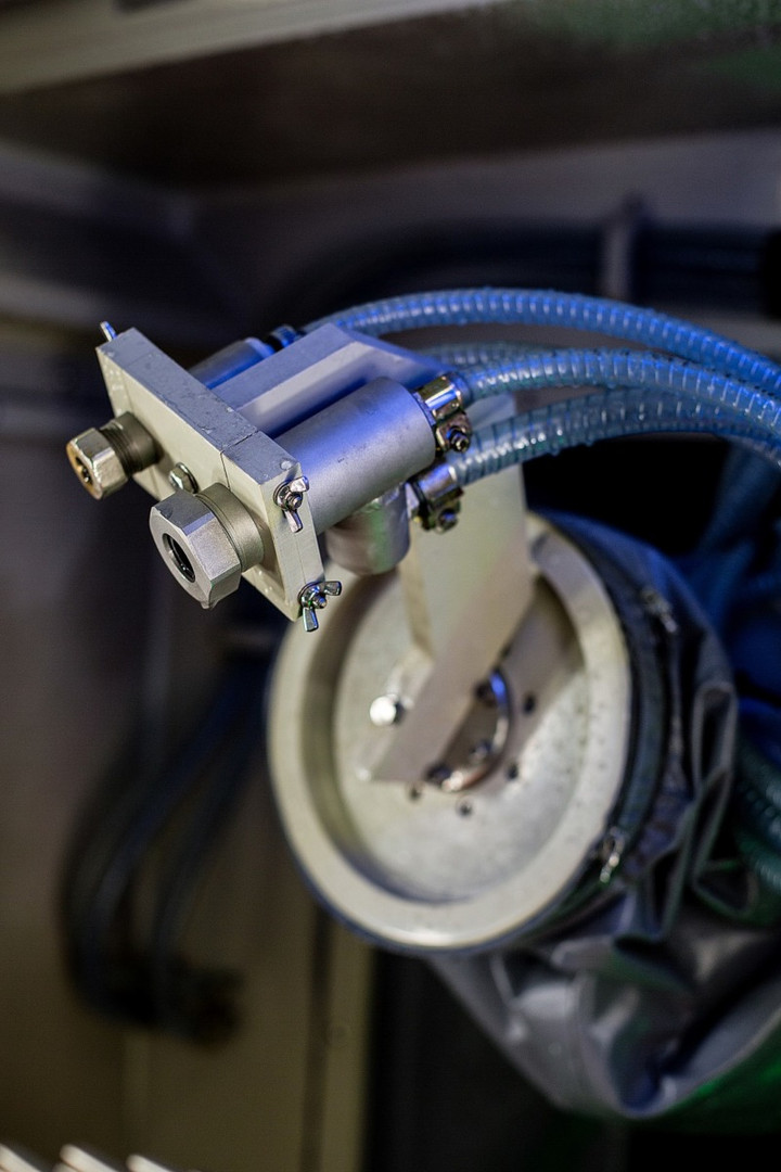 Установка состоит из двух модулей: рабочей камеры и камеры робота. В рабочей камере находится рука робота с струйным аппаратом, шпиндель-позиционер с горизонтальным валом для крепления деталей типа «диск», горизонтального стола-позиционера для обработки различных изделий. Камеры разделены кевларовой мембраной исключающей попадание абразивной пыли и влаги в камеру робота. Программное обеспечение, робот и сервоприводы обеспечивают удобную настройку и программирование для обработки сложных изделий. Горизонтальный стол–позиционер позволяет обрабатывать габаритные изделия диаметром до 1000мм, высотой 800мм. и весом до 200кг.