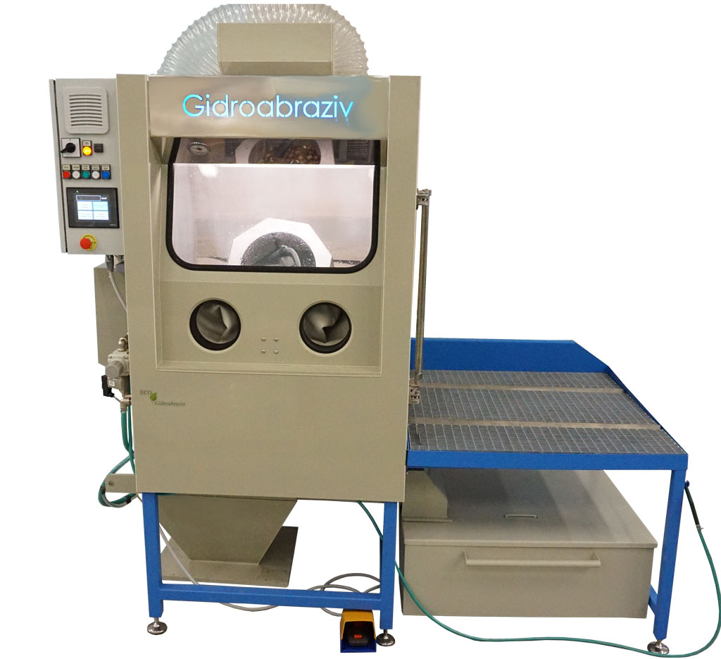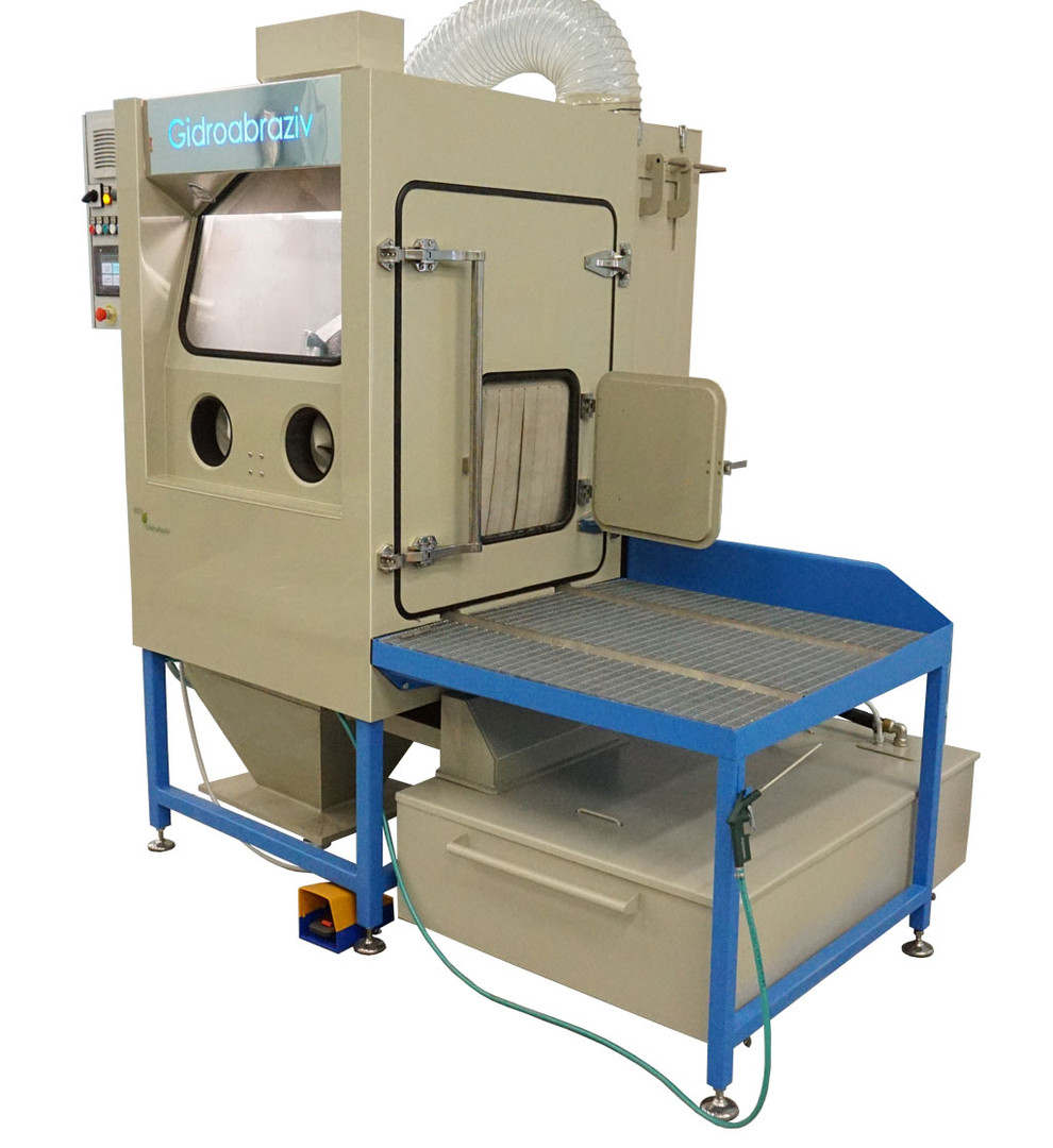 Установка гидроабразивной очистки КС-100ТГ/СК предназначена для удаления в ручном режиме с поверхности изделий окалины, ржавчины, окисных пленок, следов СОЖ, последствий термообработки и мех. обработки до получения качества чистоты Sa3, матирования, а также снижения шероховатости, ликвидации центров будущих растрескиваний, для подготовки поверхности деталей под нанесение покрытий, гальванику, цинкование. Благодаря сменным технологическим конусам установка позволяет работать на быстросменяемых различных видах абразивов.