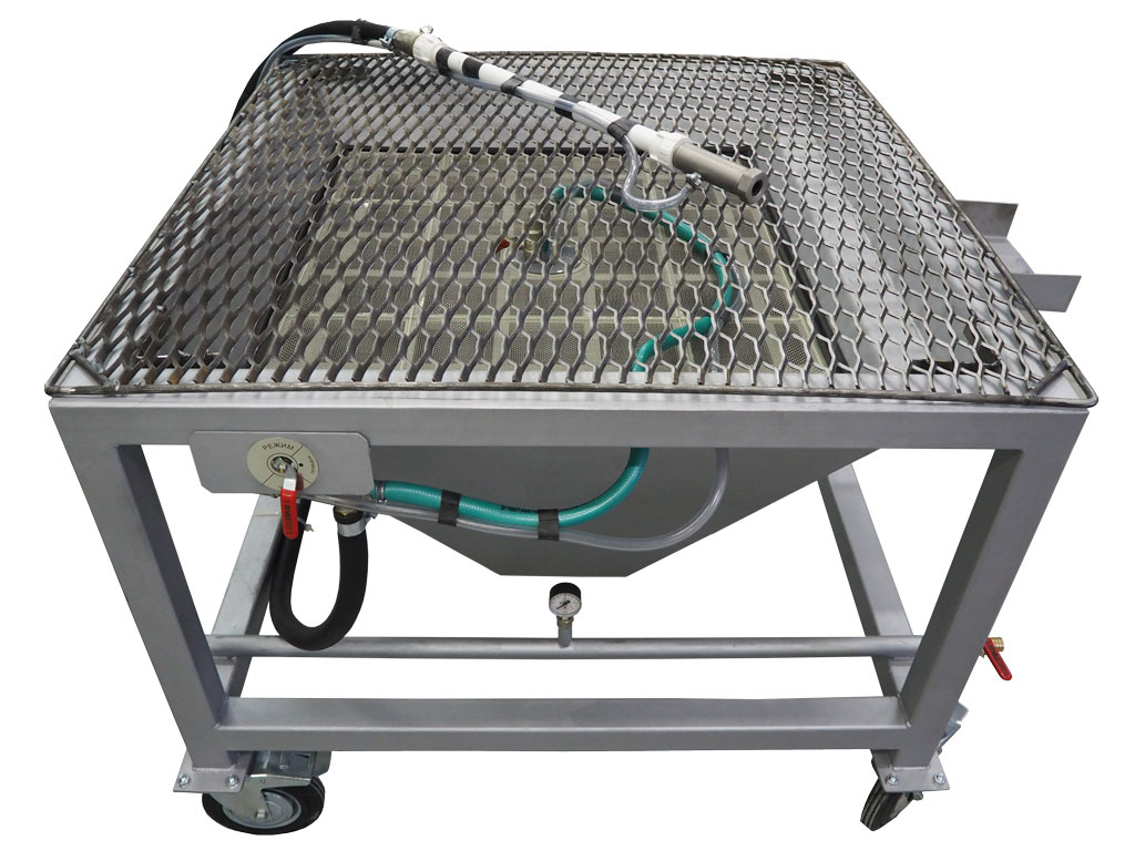 Мобильная установка гидроабразивной очистки МБ-140 открытого типа с принудительной подачей суспензии предназначена для удаления в ручном режиме в мобильном варианте с поверхности изделий окалины, ржавчины, старой краски до получения качества чистоты Sa3, для подготовки поверхности под нанесение покрытий, окраску.