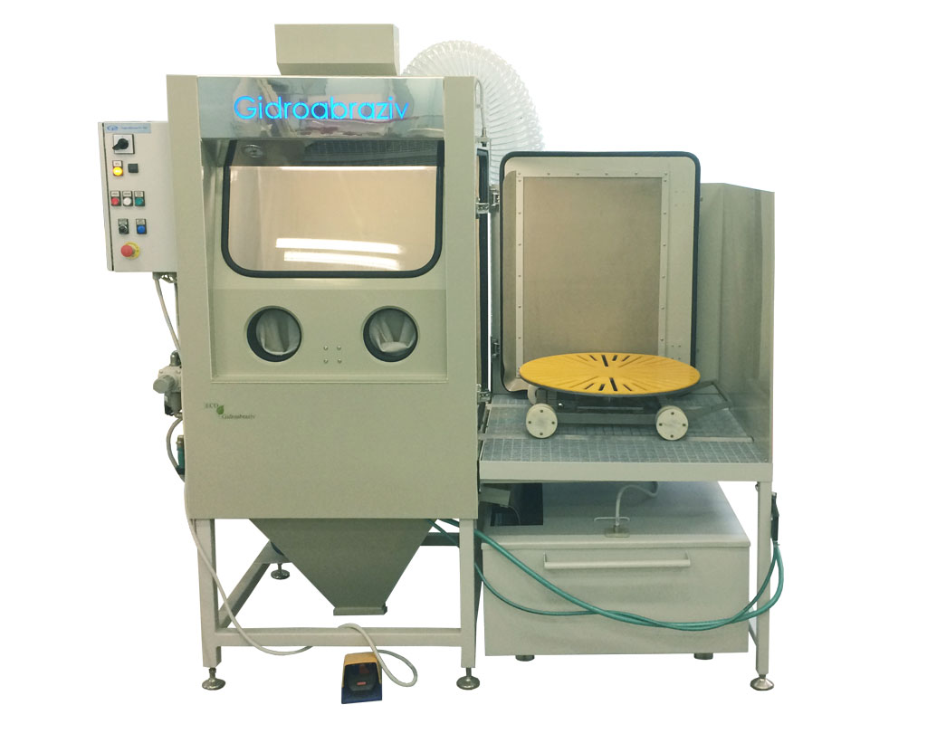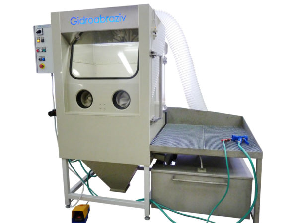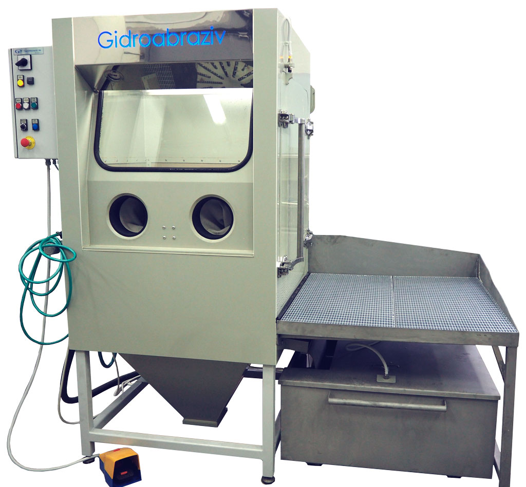 Установка гидроабразивной очистки КС-100, герметичная, с замкнутым циклом технологической среды, предназначена для удаления в ручном режиме с поверхности изделий нагара, окалины, ржавчины, окисных пленок, следов СОЖ, последствий термообработки и мех. обработки до получения качества чистоты Sa3, придания внешнего вида, матирования, сатинирования, а также снижения шероховатости, ликвидации центров будущих растрескиваний, для подготовки поверхности деталей под нанесение покрытий, гальванику, цинкование, полирование.
