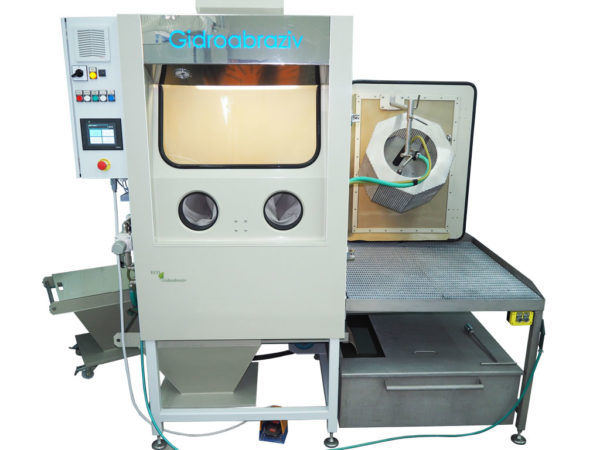 Установка имеет кругооборот воды, абразива, хим. присадок с непрерывным шламоотделением, выездной на рычаге вращающийся столик, регулировку интенсивности гидроабразивной струи, настройку концентрации абразива в суспензии, подогрев воды, качественную очистку отработанного воздуха до норм ПДК, низкий уровень шума.