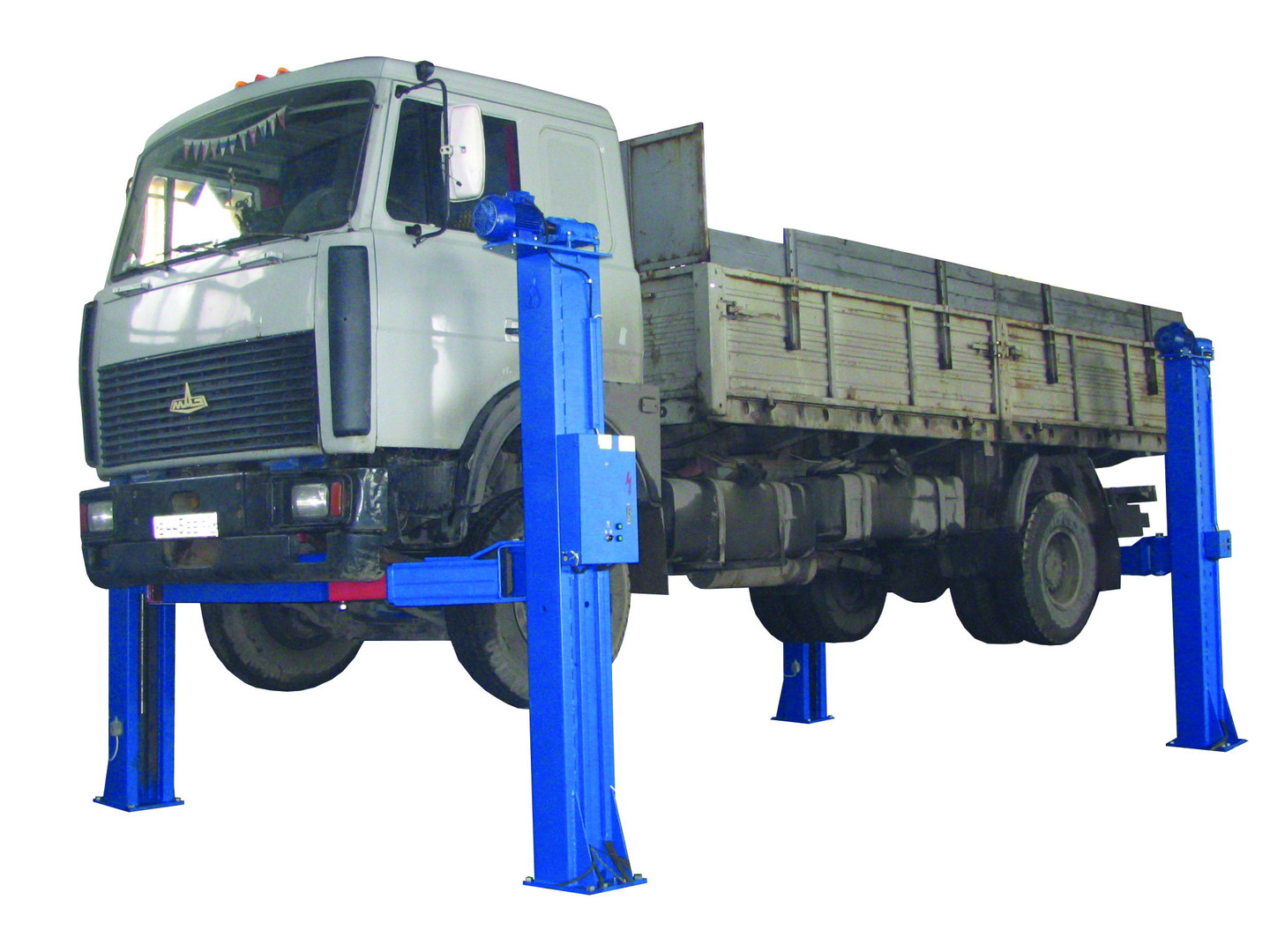 Подъемник имеет четыре стойки. Подъем за раму грузовых автомобилей общей массой до 10 тонн. По техническим параметрам, надёжности и качеству изготовления не уступают лучшим зарубежным аналогам при значительно меньшей стоимости. Рабочие гайки из полиамида повышенной износостойкости. Подъемник оснащен концевыми выключателями нажимного действия ограничивающими ход каретки вверх и вниз и многоуровневой системой безопасности. По отдельному заказу комплектуется установочными рамами.