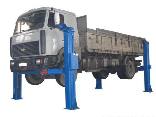 Подъемник имеет четыре стойки. Подъем за раму грузовых автомобилей общей массой до 16 тонн. Рабочие гайки из полиамида повышенной износостойкости. Подъемник оснащен концевыми выключателями нажимного действия ограничивающими ход каретки вверх и вниз и многоуровневой системой безопасности. По отдельному заказу комплектуется установочными рамами.
