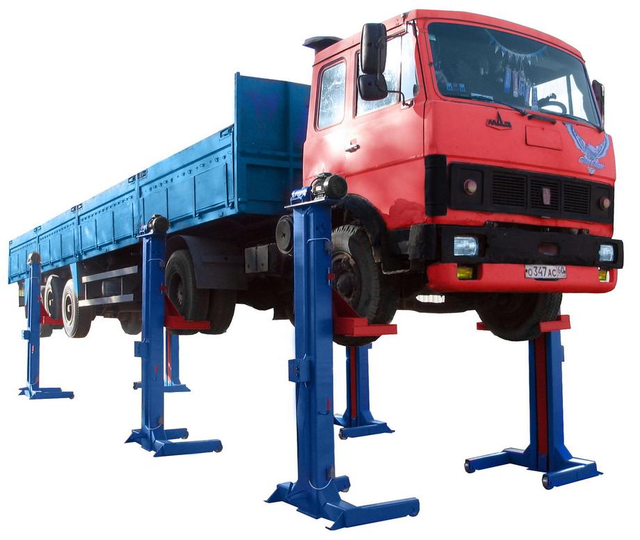 Подъемник предназначен для вывешивания грузовых автомобилей весом до 24 т (в зависимости от количества стоек) при выполнении их технического обслуживания и ремонта. Подхват автомобиля производится за колеса. Комплектация из шести подкатных стоек позволяет обслуживать сочлененные автобусы и трехосные грузовые автомобили.