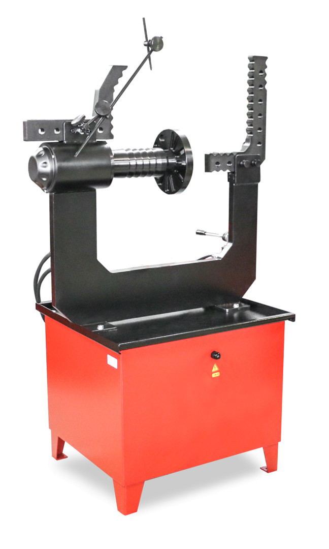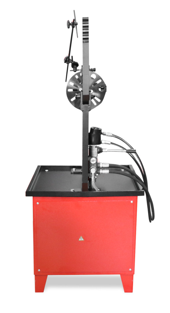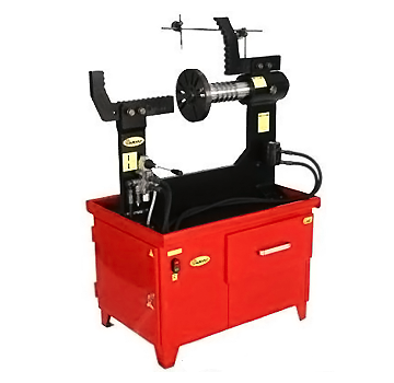 Ремонтируемый диск закрепляется на планшайбе. Гидравлический привод стенда позволяет достигать номинального усилия в зоне правки до 1500 кг и максимального усилия в зоне правки 5300 кг при рабочем давлении гидросистемы 140 кгс/см2. Комплектуется сменными рихтующими насадками и рабочими штоками, предназначенными для исправления повреждений различного вида. Управление рабочим гидроцилиндром осуществляется при помощи гидравлического распределителя со встроенным редукционным клапаном и регулятором давления. Вращение насоса осуществляет электродвигатель, соединенный с насосом через муфту. На обратной стороне струбцины расположен указатель биения (металлический стержень с острым основанием) для четкого определения места ремонта. Для хранения набора вспомогательных инструментов в конструкции станка для правки дисков предусмотрен инструментальный ящик. Опция: опорный кронштейн для дисков до 24-х дюймов.Характеристики